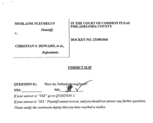 On February 26, 2025, Joe Fowler and Sam Garson obtained a defense verdict in a commercial auto accident case after a six-day trial in the matter of Fleurelus v. Howard, et al. in the Philadelphia County Court of Common Pleas. Attorneys Fowler and Garson represented Silvi Concrete of Philadelphia and its driver, Chrisian Howard. Plaintiff, who was represented by Morgan & Morgan, demanded $1 million prior to the start of the trial for alleged permanent injuries including a torn rotator cuff requiring surgery. Plaintiff also alleged that she was unable to return to work as a certified nursing assistant and had $140k in boardable medical specials.